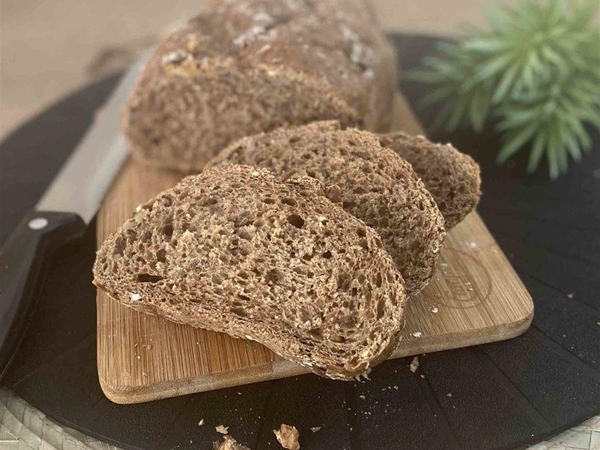 Op basis van desem bakken we dit brood met tarwebloem, moutmeel en walnoten.