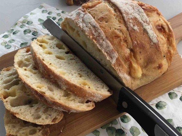 Wit desembrood met stukjes oude kaas en mosterd. Smullen!